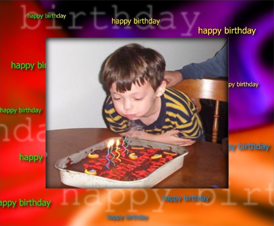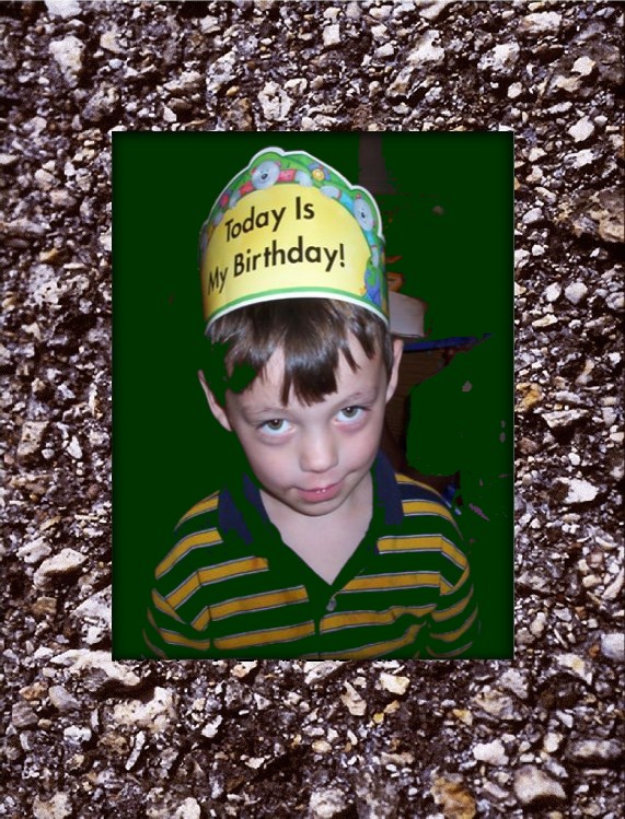 This is Hunter blowing out the five curly candles on his birthday cake. |